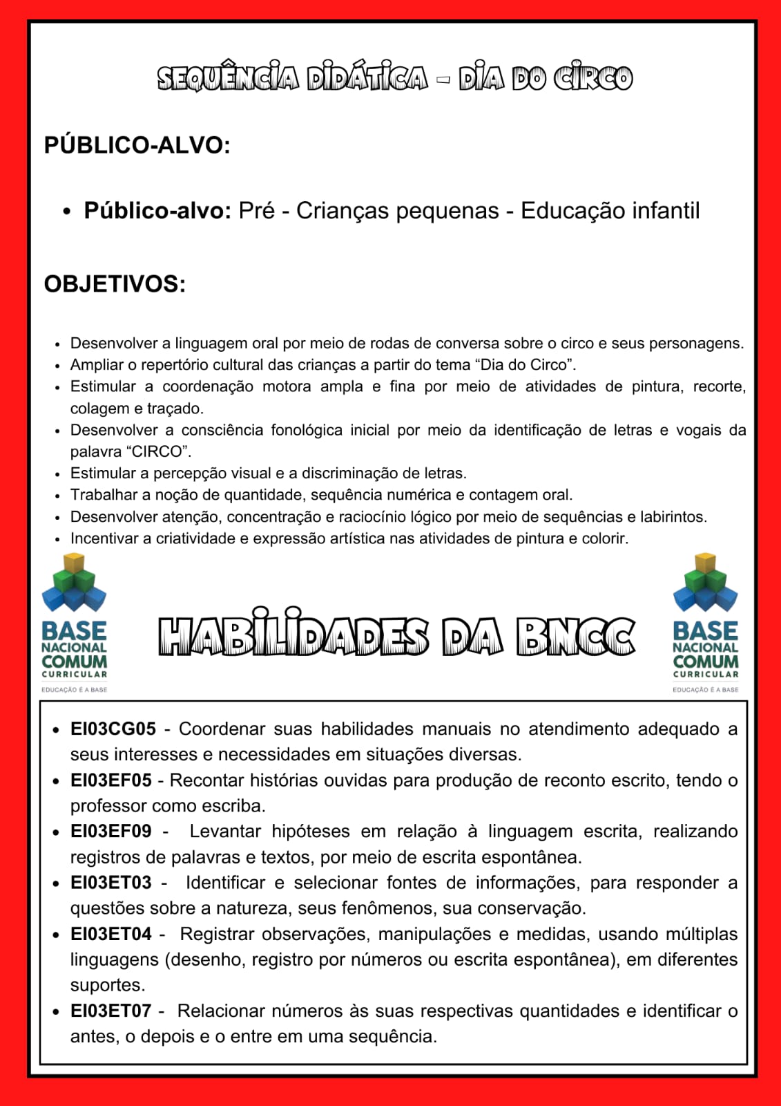 Descrição: O circo é um universo cheio de cores, alegria, movimento e imaginação — e essa sequência didática foi pensada para transformar essa temática em uma experiência completa, organizada e significativa para o Pré.