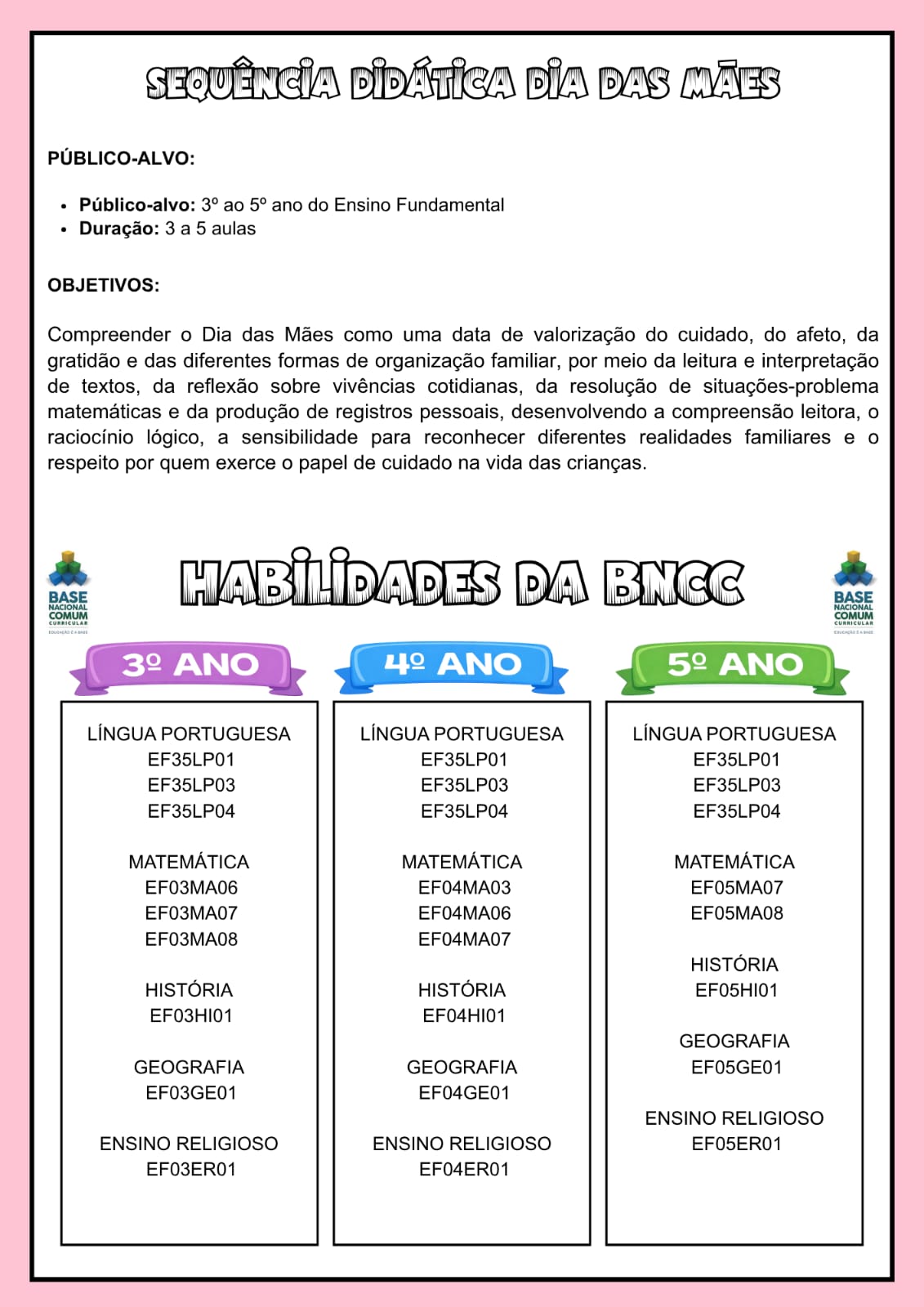 SEQUÊNCIA DIDÁTICA DIA DAS MÃES – 3º AO 5º ANO DO ENSINO FUNDAMENTAL